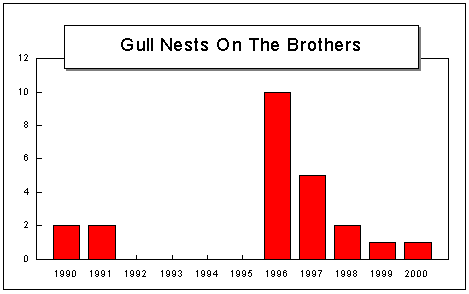 One gull nest was removed from The Brothers in 2000 and only a few tern eggs appeared to have been depredated by gulls. Crows have not been a problem, though, a half a dozen or so adult terns may have been taken by owls.