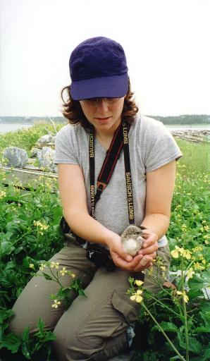 | Becky Whittam on N. Brother holding a Roseate Tern chick |