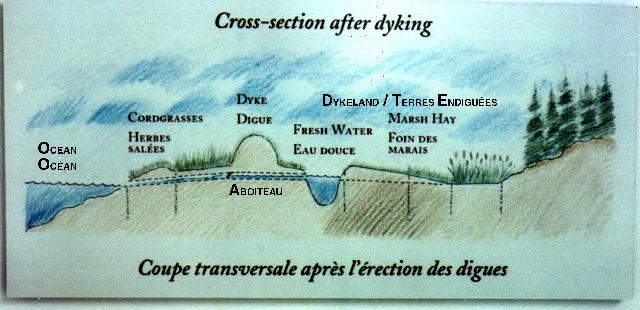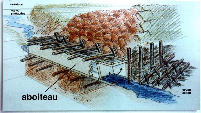 The Acadians constructed earthen dykes to isolate areas of saltmarsh from repeated inundation by the tides. Into the base of each dyke they built "aboiteaux" - wooden sluices fitted with swinging doors that allowed excess fresh water to drain from the newly claimed land, but shut to prevent re-entry of salt water at high tide. Drainage ditches channeled standing water away from the saturated soil, and after rainwater had diluted the salt content for a few years, the new fields were ready to sustain crops and livestock. Today, modern aboiteaux based on the same engineering principles are employed to maintain drainage of dykelands.