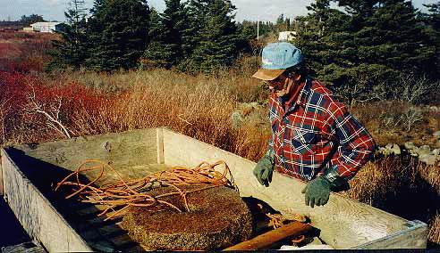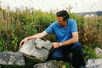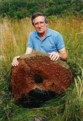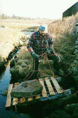 The film clearly shows the location of the possible millstone. A number of locals had already seen the film in a pre-release screening in January. People were asking "where is the stone now?". Réal would answer that it was still there, and they would respond with "aren't you afraid it could be vandalized or stolen?". The answer was "YES". So, Réal wrote the provincial museum about removing it before the airing of the film. By Friday, February 13th, he had received no response to his letter and we happened to have the time to undertake its removal. We removed the stone and stored it in the steel building adjacent to the PHARMASAVE pharmacy, West Pubnico, for safe keeping until the Village Historique de Pubnico-Ouest or the Musée Acadien de Pubnico-Ouest could accomodate it. Milton D'Eon was with us recording the process on video tape.