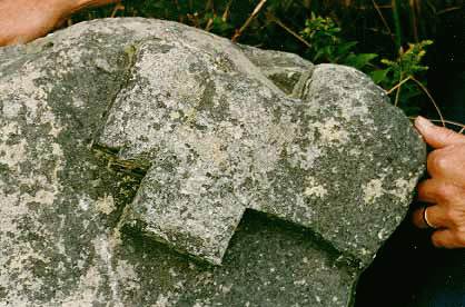 The stone may or may not have a cross (or part of a cross) carved onto it in high relief. It is possible that the cross is from natural fracture of the rock.