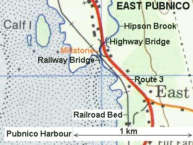 | Hipson Brook area, East Pubnico, Yarmouth County, Nova Scotia. The Stone Bridge (not seen on above map) can be found between the highway bridge and the railway bridge |