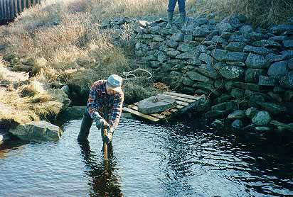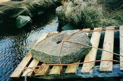 On September 4, 1997, we checked the area again, and while I had all my interests focused on a green frog, Réal called out, "There it is"! It was located in a small adjacent pool on the north side of the brook. When the water flow of the brook and the tide are low, the millstone would be partially dry in the black mud. At high tide or when the water level of the brook is high, the stone would be under water.