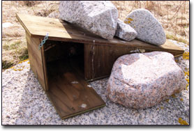 On May 5, 2002, I placed six new design Roseate Tern nest boxes on N. Brother, two on S. Brother and four on île-aux-fraises (a.k.a. Green Island to the south of Wedgeport). We also fixed up other nesting structures on the islands. The "new design" boxes are wedge shaped with plywood roof and floor (see photos below), and I believe they were designed by Dr. Jeff Spendelow, wildlife biologist, Patuxent Wildlife Research Center.