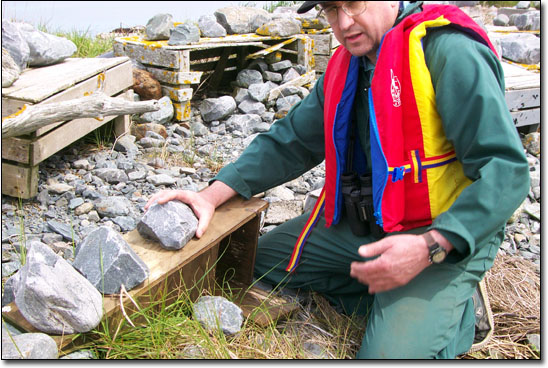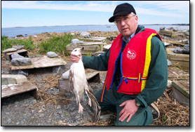 May 22, 2002 - I returned to N. Brother with Franklyn and Jean-Bernard d'Entremont, and Nils Jorgensen, to remove the gull. It was still there and easily captured. Nils was in West Pubnico visiting from Denmark.