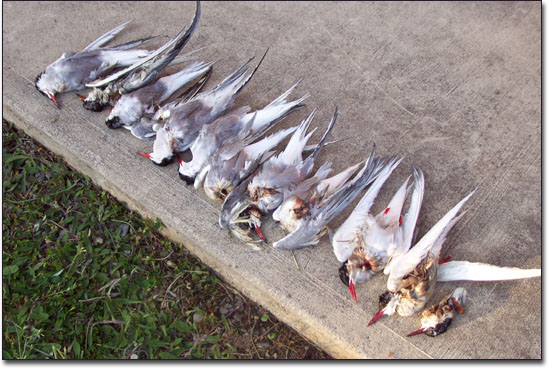 About a dozen dead adult Common and Arctic Terns were collected from N. Brother. Some had been decapitated. Most were uneaten. Owl? Mink? One of the Common Terns had a broken bill.
