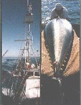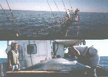There were so many things we had never seen before. The fishermen harpooned 2 tuna on this trip. The first weighed 250 pounds, dressed; the second, 550 pounds dressed. On the first day they had a spotter plane looking for tuna which would be feeding and finning at the surface. The smaller tuna was harpooned one that day. Acting on the spotter plane's pilot's instructions, Gérard would steer to the spot from his station up in the crows nest on top of the mast, and then slowly try to creep up onto the fish. Most of the times the boat would get within harpooning distance, the tuna would dive and disappear. The two "strikers", Harland and Jason, with harpoon in hand would be stationed on the end of the bowsprit-like "stand" anxiously waiting for the right moment to launch their harpoons.