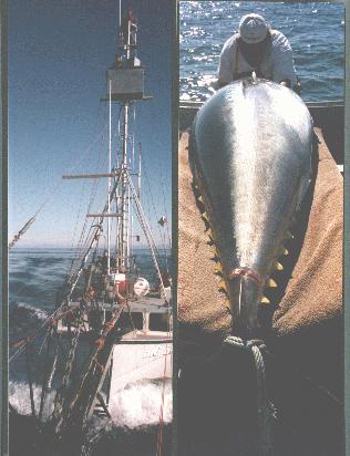Left: The 45 ft. Cape Island boat, the "BIG EYE" hunting for Blue Fin Tuna.